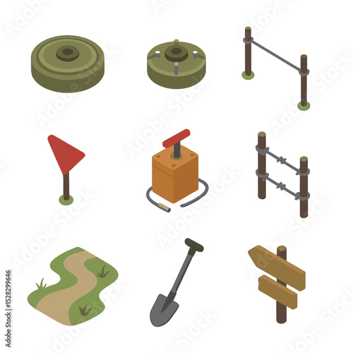 Minefield Setup Icons. Isometric Flat icon set of minefield emplacement setup: anti-tank mine, anti-personnel mine, tripwire