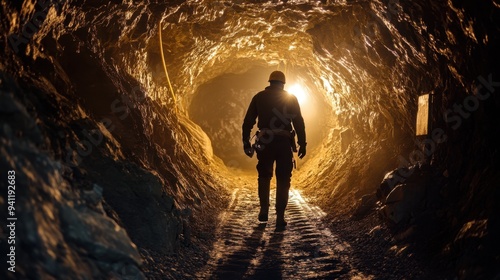 Miner walking through narrow tunnel with lantern shadows cast on rocky walls intense focus on path ahead underground journey