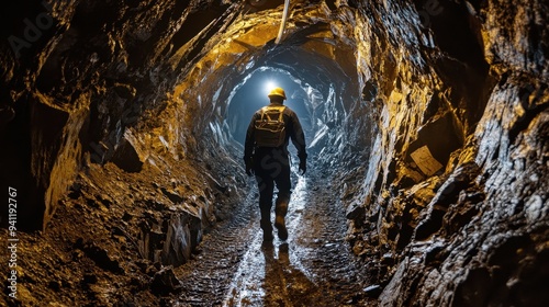 Miner walking through narrow tunnel with lantern shadows cast on rocky walls intense focus on path ahead underground journey