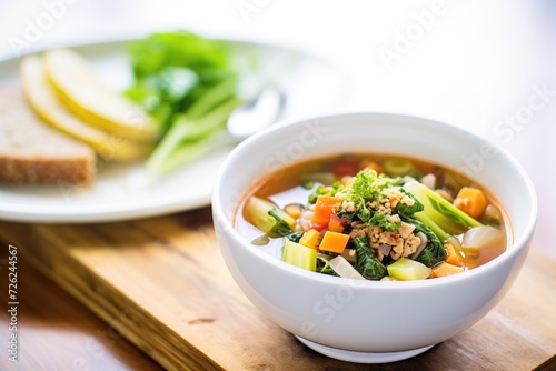minestrone soup in a bowl with a side of crusty bread
