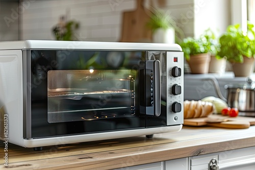 Mini electric oven set on a lovely wood tabletop with gentle blur
