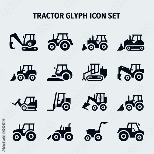 Mini excavator glyph icon set for construction needs with various tractor and mini excavator types. Suitable for constructionthemed designs.