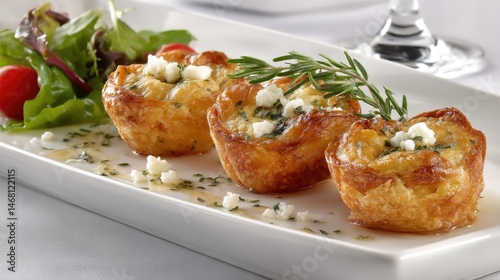 Mini Quiches Appetizing Bites with Greens on a White Plate.