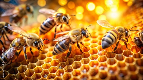Miniature Beehive: Honeybees Working in a Honeycomb, Tilt-Shift Photography