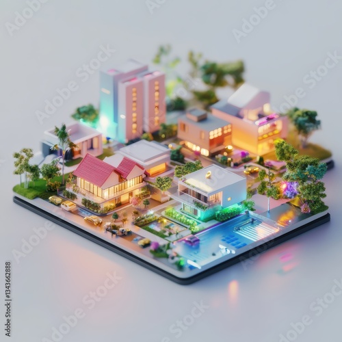 Miniature city model, vibrant, illuminated.