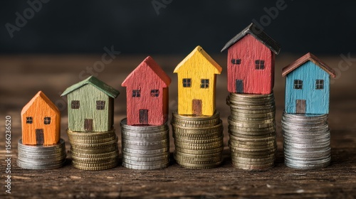 Miniature Colorful Houses on Stacks of Coins Representing Growth in Real Estate Investment and Financial Success