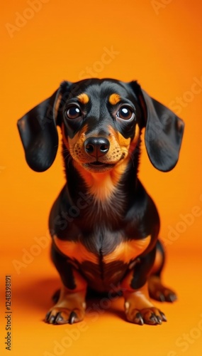 Miniature dachshund, silly expression, bright orange setting, studio, playful, funny