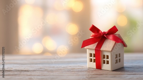 Miniature house building with red ribbon on wooden surface. Sweet home gift concept with warm bokeh background for real estate.