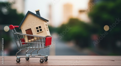 Miniature house inside a shopping cart on a wooden surface outdoors.