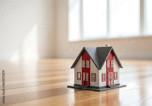 Miniature House Model on Wooden Floor, Bright Interior, Real Estate Concept.