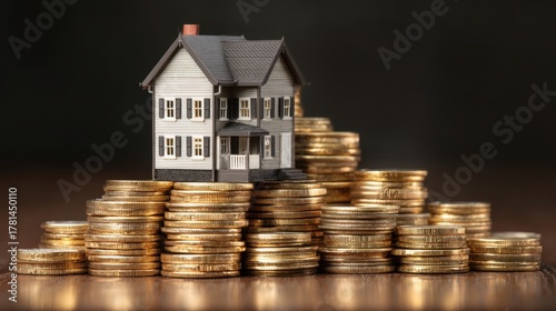 Miniature house model placed on stacks of gold coins symbolizing real estate investment and financial growth in the housing market for prosperity and wealth