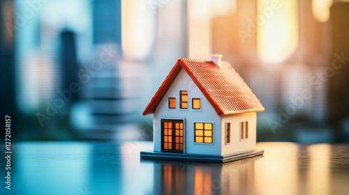 Miniature house model with red rooftop on desk showcasing real estate concept against city skyline