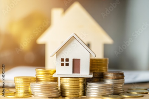 Miniature house on golden coin stacks investment property savings mortgage finance real estate concept.