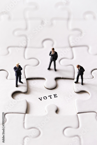 Miniature men on jigsaw puzzle with word vote