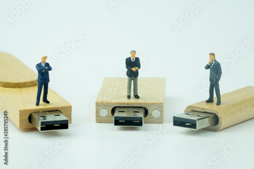 Miniature people businessman standing on wooden USB stick. Analysis data concept