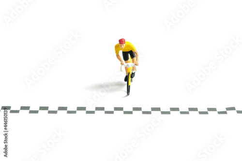 Miniature people toy figure photography. A biker with finish line, completed the bike competition, isolated on white background.