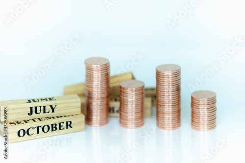 Miniature people: Wooden month and stack of coins with copy space for text using as background saving, investment, money, financial, business analytics concept.