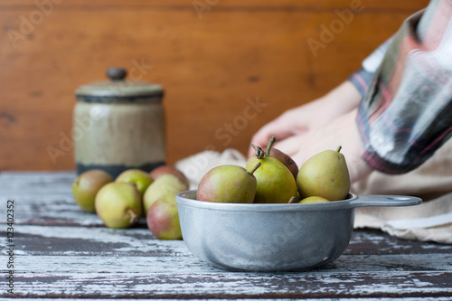 Miniature Seckel pears in a vintage pewter bowl. Female hands wiping pears with a kitchen towel. Rustic wooden table.