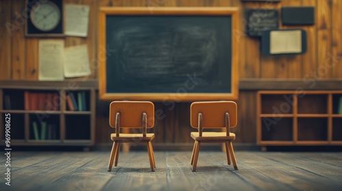 miniature vintage chairs and small blackboard in empty classroom, designed with tiny student figures for educational concept