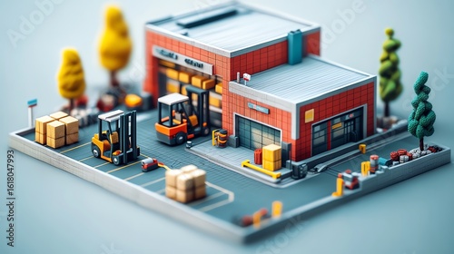 Miniature Warehouse Building with Forklifts and Storage Containers in a Toy City Scene