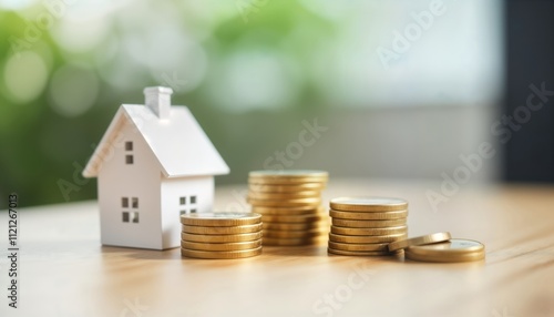 Miniature white house model sits next to stacks of golden coins on light brown wooden table. Coins in different heights representing financial growth. Concept of mortgage payments housing investment.