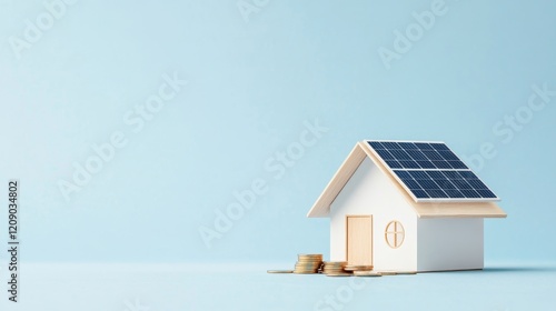Miniature white house model with solar panels placed on blue background surrounded by coins depicting investment in renewable energy and sustainable living concept