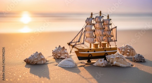 Miniature Wooden Ship Model on Beach with Seashells During Sunset