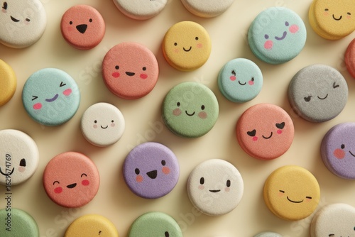 Minimal abstract cute shapes with smiling faces, soft pastel color blobs floating on white background