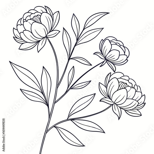 Minimal botanical line drawing of a peony flower in seamless pattern