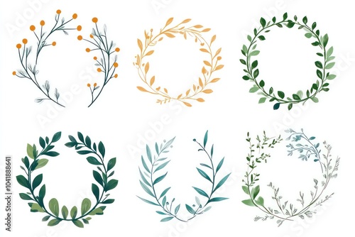 Minimal botanical wedding frame elements on white background. Set of wreath, flowers, leaf branches in hand drawn pattern. Foliage line art design for wedding, card, invitation, greeting, logo