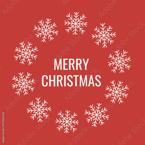 Minimal Christmas poster with white snowflakes and “Merry Christmas” text on red background. Ideal for winter cards, holiday greetings and festive seasonal design