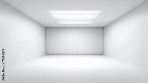 Minimal clean white room with soft natural light from ceiling, empty modern interior, perfect for product photography, calm and serene atmosphere, simple background