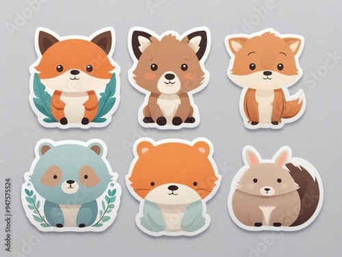 Minimal cute wild animals: raccoon, bear, and owl in sticker set.