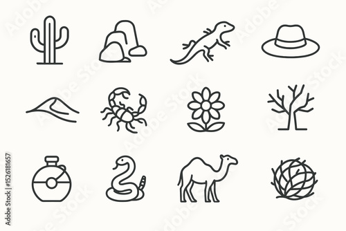 Minimal desert icons: cactus, rocks, lizard, hat, snake, camels, and more