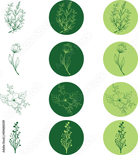 Minimal drawn floral botanical line art. Bouquets. Trendy elements of wild and garden plants, branches, leaves, flowers, herbs. Vector illustration for logo or tattoo, invitation, save the date, card