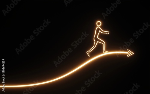 Minimal glowing figure walking along a rising arrow path, symbolizing personal growth, overcoming obstacles, and upward mindset.