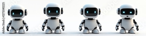 Minimal illustration of robot AI assistant character in white color. Futuristic companion with glowing neon blue eyes for support, chat, messenger, bot services. Robotics, automation, machine