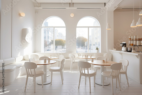 Minimal interior design of cafe or coffee cafe bar shop in clean minimalist style, decorated with warm tone, relaxing tones with glossy ivory white round corner counter and coffee machinery.