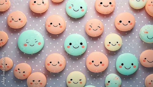 Minimal kawaii background, smiling cartoon faces on polka dot pastel surface