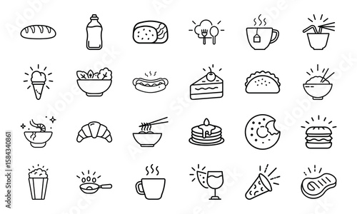 Minimal Line Art Food and Drink Icon Set Featuring Bread, Beverages, Desserts, Meals, Snacks, and Cutlery on White Background for Restaurant and Culinary Design Projects