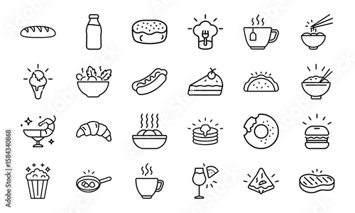 Minimal Line Art Food and Drink Icon Set Featuring Bread, Beverages, Desserts, Meals, Snacks, and Cutlery on White Background for Restaurant and Culinary Design Projects