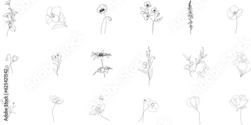 minimal line flower and botanical graphic sketch drawing, trendy tiny tattoo design, floral elements vector illustration