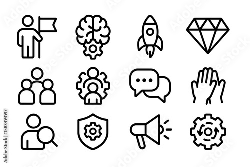 Minimal line icons: leadership, innovation, communication, teamwork, security