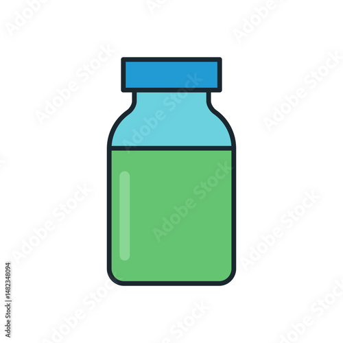 Minimal medical icon of pharmaceutical vial containing green fluid with light blue body and dark blue lid design