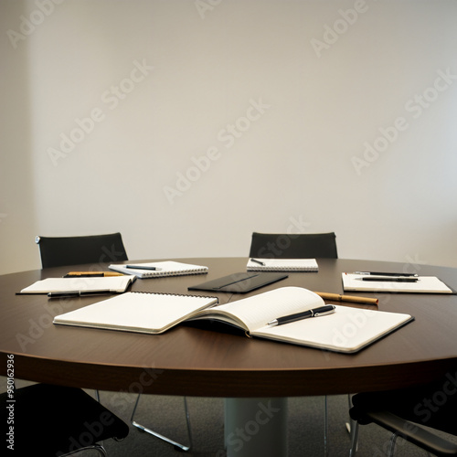 Minimal meeting room with a large round table prepared with notebooks and pens before the meeting