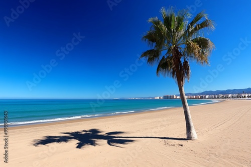 Minimal palm tree and beach scene, capturing the essence of Malaga’s coastal lifestyle with simple lines and a soft gradient representing the sea and sand