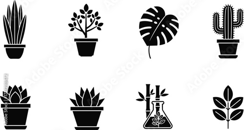 Minimal plant icon set, black and white botanical symbols, indoor potted plants, monstera leaf, cactus, succulent, eco design elements