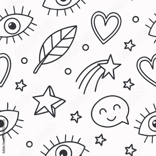 Minimal Playful Doodle Icons – Seamless Vector. Fun seamless pattern of minimal doodle icons like faces and hearts in pastel tones. Great for stationery, youth branding and digital use.