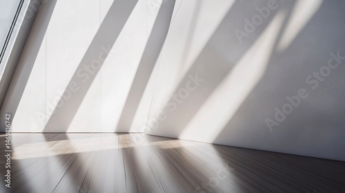 Minimal room design, blank white walls, wooden floor with reflective highlights from sunlight through a window, sharp side-angle shot.