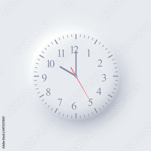 Minimal round wall clock with simple hour marks and modern design. Elegant analog clock in neomorphism style on light grey background. Vector illustration.